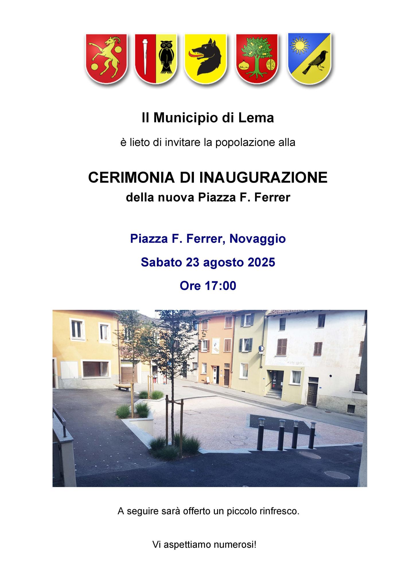 Abbiamo il piacere di informarvi che il Municipio di Lema inaugurerà la nuova Piazza Ferrer nel quartiere di Novaggio con una cerimonia ufficiale che si terrà sabato 23.08.2025 alle ore 17:00. Al termine della cerimonia, sarà offerto un piccolo rinfresco ai partecipanti.