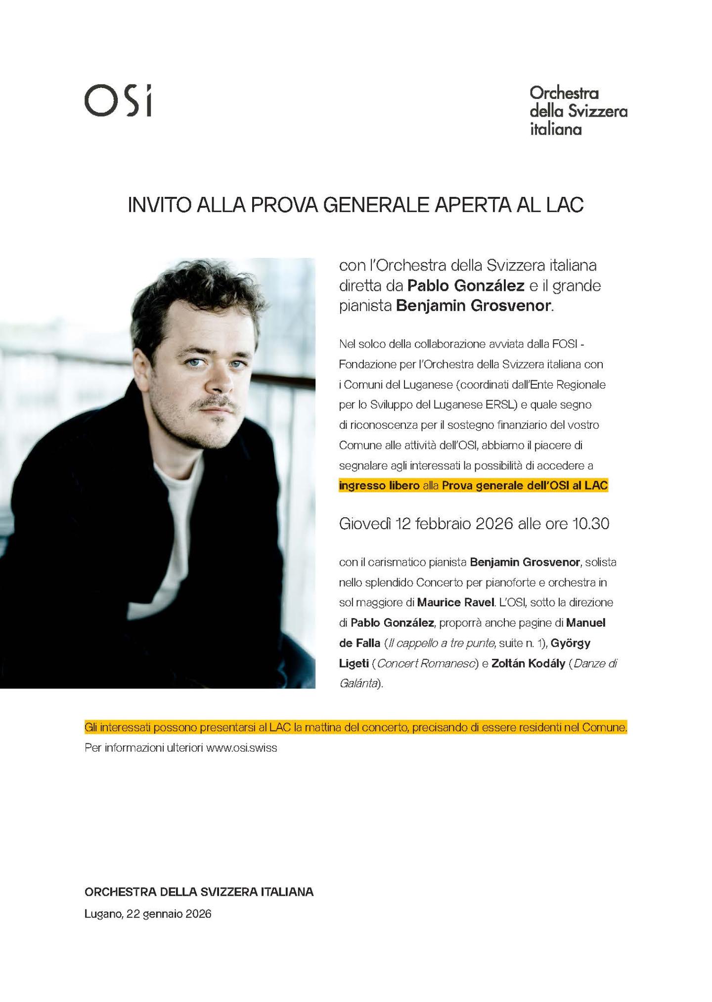 Abbiamo il piacere di segnalare agli interessati la possibilità di accedere a ingresso libero alla Prova generale dell’OSI al LAC